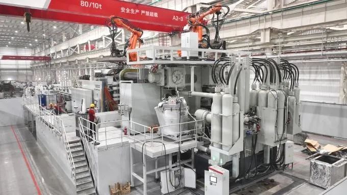 力劲历时3年研发的超万吨双压射压铸技术,成功解决了因填充距离过大导致产品远端性能衰减的难题。该技术通过单个锁模机构配合两个压射系统来实现高效的铝液填充,不仅有效缩短了铝液的流动路径,减少了气孔和其他缺陷的产生,还大幅提升了产品的强度与稳定性。在此之前,超大型一体化压铸主要应用于车身后地板、电池壳体、前舱等分段式的集成。超万吨双压射压铸单元的成功开发将实现更大尺寸、更高集成度的一体化压铸成型,这一创新大大减少了车身部件的数量,提高了车身的刚性和轻量化性能。