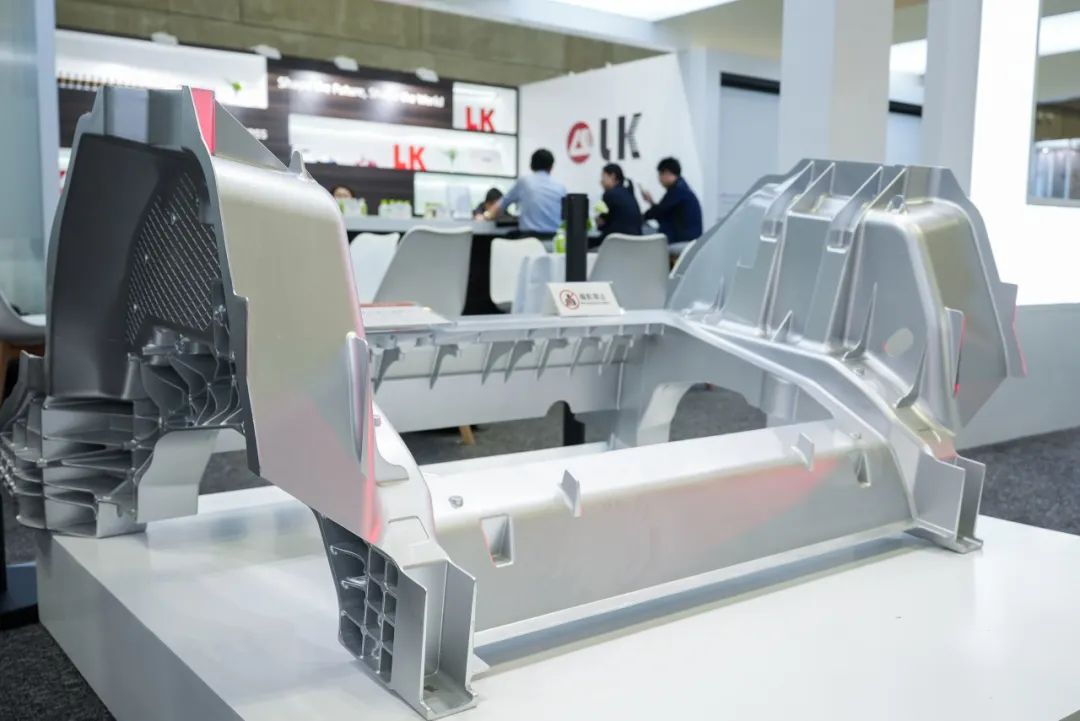 由力劲万吨级双压射压铸机生产的全球首个全尺寸整体车身一体化压铸件,在本次日本压铸展首次海外亮相。吸引了现场众多业内人士的关注。此外,力劲还展出了多款新能源汽车零部件,包括整车底盘、后地板、减震塔、电池托盘等。